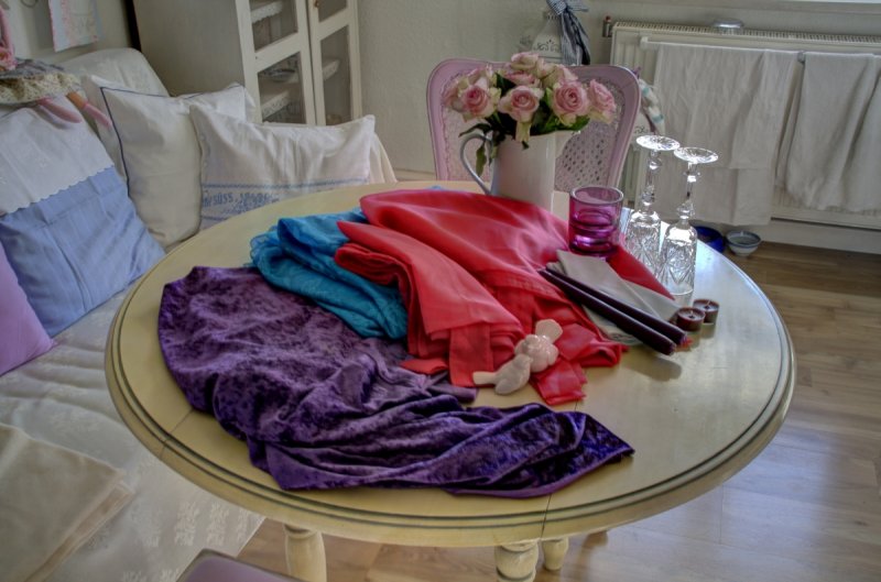 Die Zutaten für die Basis findest du in deinem Wäscheschrank. Öffne ihn und schau mal nach, was für farbige Textilien du darin findest. Versuche sie nicht nach ihrem Zweck zu beurteilen. Löse dich von den Gedanken, das ist ein Betttuch, das eine Gardine, das ein Tischtuch und das ein Stück Dekostoff. Gehe nur nach den Farben. Suche dir mindestens drei kontrastierende aus. Je größer die Menge um so opulenter fällt dein Tafel-Kleid aus.