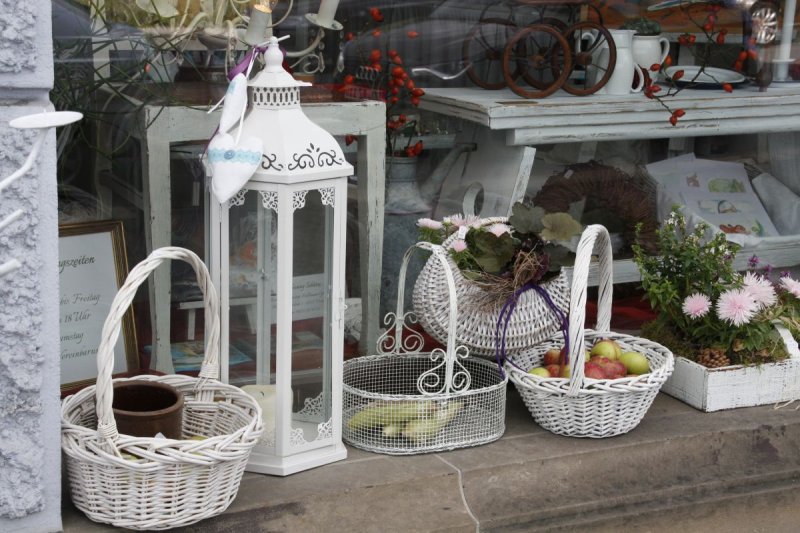 Echt Shabby Chic kommen diese Blumensäule (verkauft) und der alte Korbhocker daher. Auf beiden könnte statt Pflanze auch ein schönes großes Windlichtglas stehen.