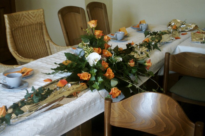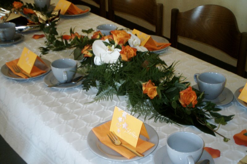 Auf den Fotos könnt ihr sehen, wie glücklich Pia und Uwe ihre Deko genießen. Die Blumengestecke für die Tafel fertigte damals eine Floristin an.